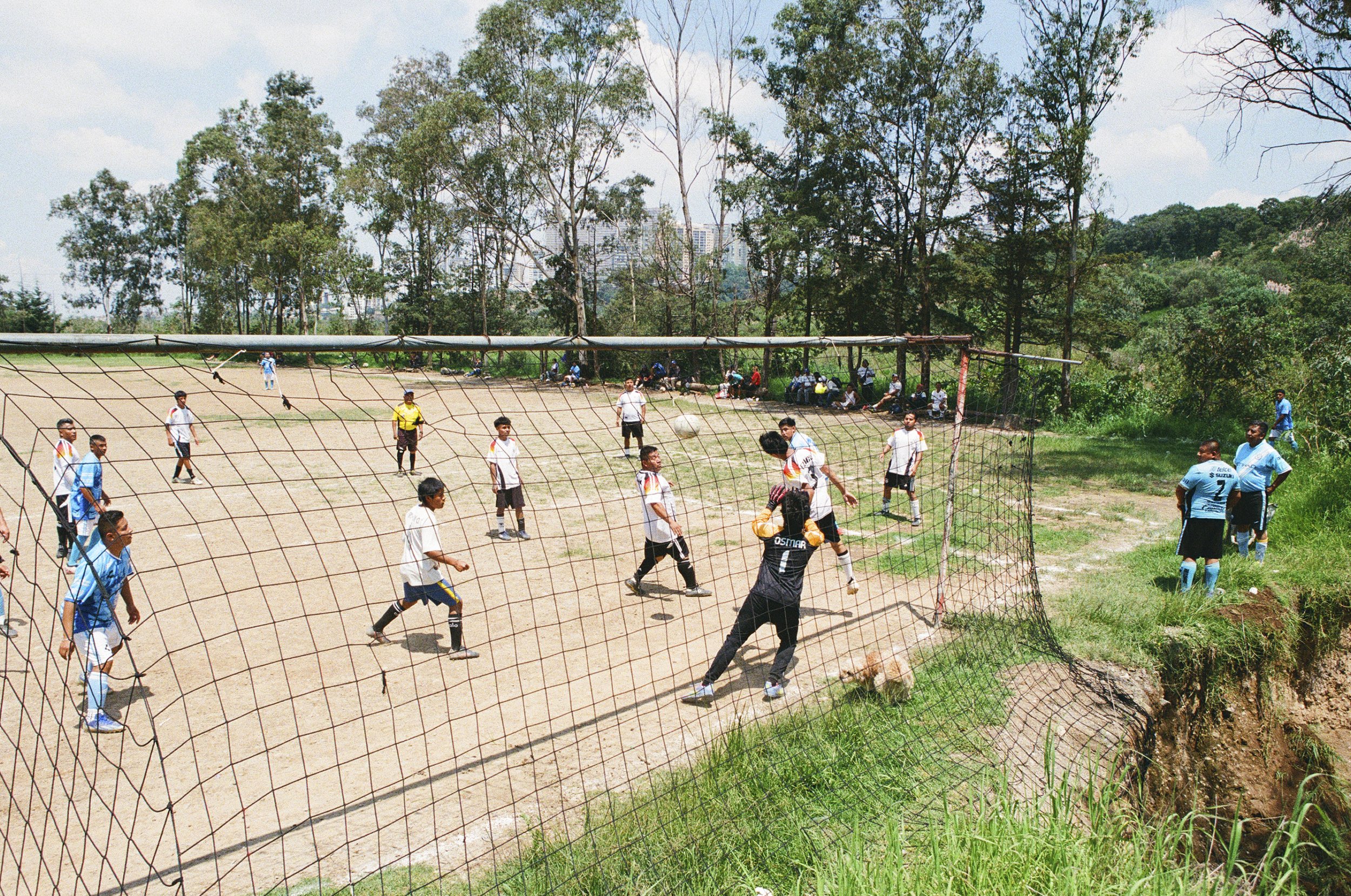 “A Sunday league match at El Castillo on the outskirts of Mexico City: a corner kick curling toward goal amid chaos—a small dog on the goal line and a dangerous gully just behind it. Beautiful amateur football chaos. Shot on FUJI 400 35mm film on a Canon A2e.”