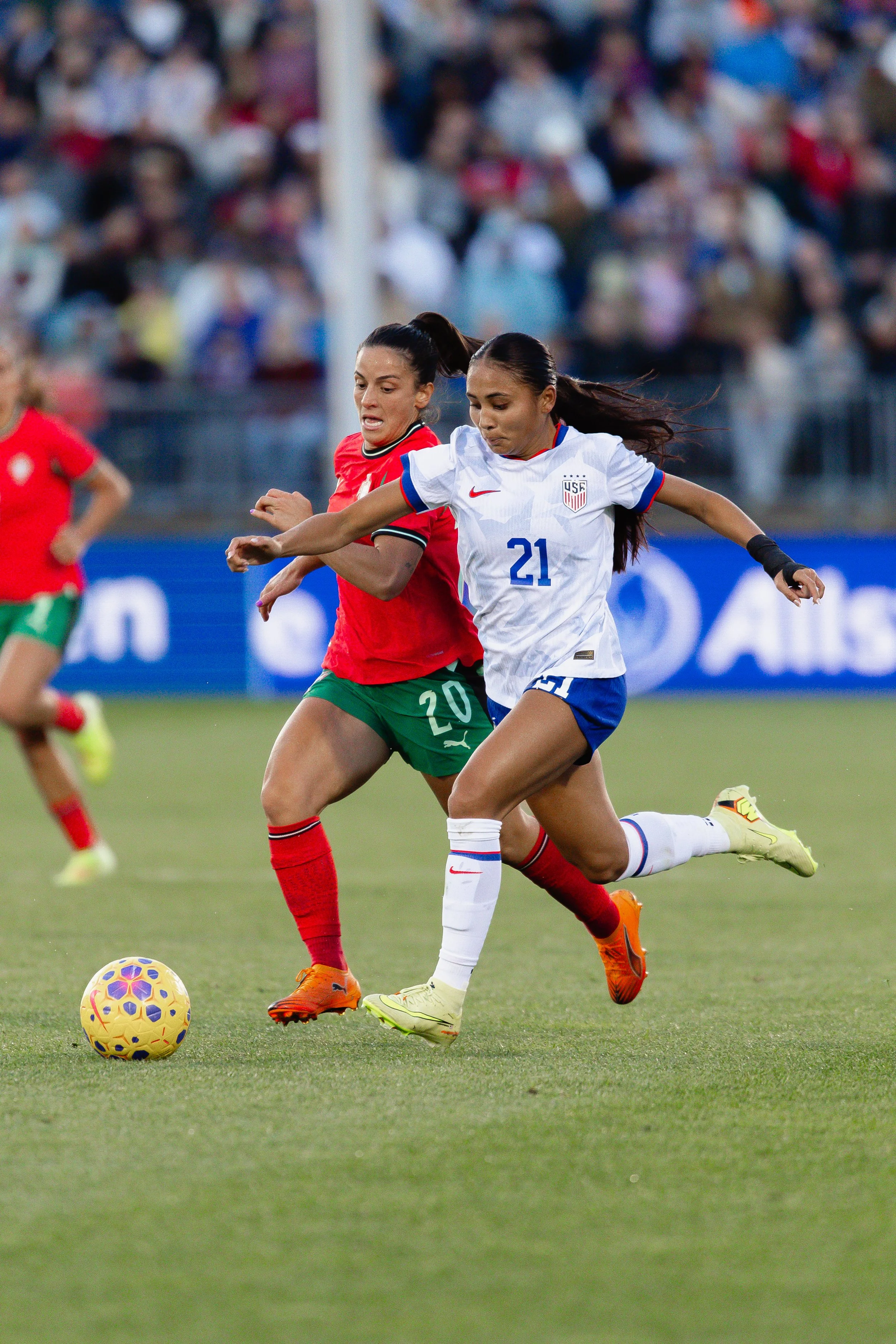 It took less than a minute for Moultrie to make her mark. Charging onto a loose ball at the top of the box, she drilled a left-footed strike into the corner — her first of the afternoon and the 22nd first-minute goal in USWNT history. Portugal equalized moments later through Jéssica Silva, whose glancing header found the far post to level the match 1–1.